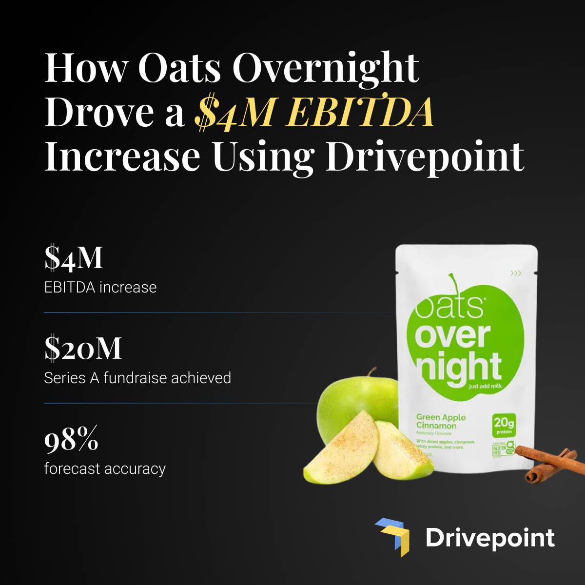 The facility expansion decision was just the beginning. Since implementing Drivepoint, Oats Overnight has achieved 98% forecast accuracy—a level of precision that enables better planning across every function. That accuracy helped them secure a $20 million Series A fundraise, demonstrating to investors that the business was built on solid financial fundamentals, not hopeful projections.